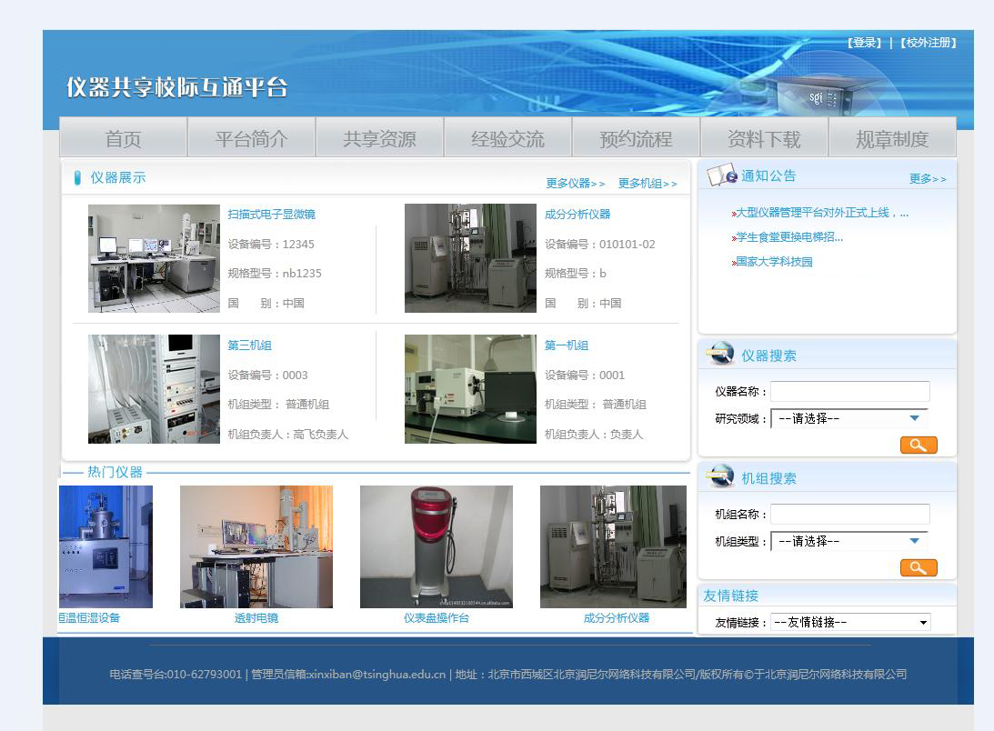 在該模塊中用戶可以查看到關(guān)于平臺(tái)簡(jiǎn)介、共享資源、經(jīng)驗(yàn)交流、預(yù)約流程以及相應(yīng)的規(guī)章制度。用戶使用共享系統(tǒng)可以查看到最新儀器信息及熱門儀器信息,為了方便用戶的使用,在門戶網(wǎng)站上添加了相應(yīng)的搜索功能。