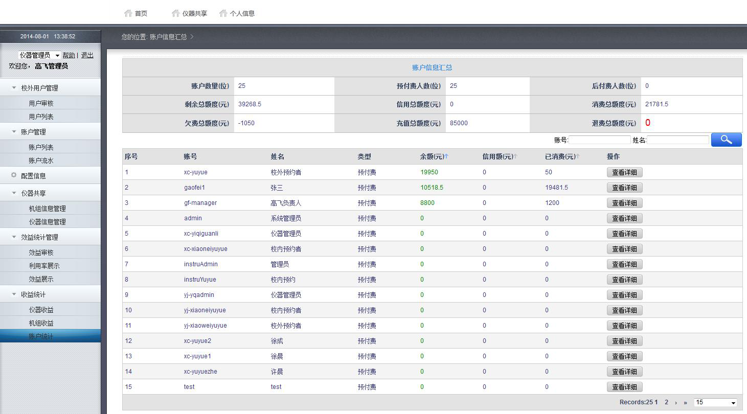 該模塊的是將機(jī)組儀器開放使用所帶來的效益的統(tǒng)計(jì)的展示,在該模塊中儀器管理儀器可以查看到機(jī)組或儀器所帶來的效益的詳細(xì)信息。同時(shí)管理人員也可以查看到系統(tǒng)中所有預(yù)約者的賬戶流水信息。