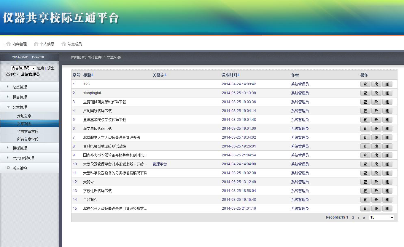 管理員可以將使用規(guī)章制度、學(xué)校信息、關(guān)閉時(shí)間段,共有的屬性國(guó)家統(tǒng)一規(guī)定國(guó)別碼、共享分類代碼、資產(chǎn)分類代碼、特色代碼,儀器所在的院系或?qū)嶒?yàn)室在此添加。添加后的數(shù)據(jù)可供所添加機(jī)組、儀器使用。