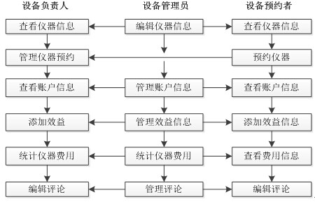 系統(tǒng)的主要功能有共享門戶模塊、機(jī)組儀器模塊、儀器預(yù)約管理模塊、效果統(tǒng)計(jì)管理模塊、效益統(tǒng)計(jì)管理模塊、儀器評(píng)價(jià)模塊、用戶管理模塊、賬戶管理模塊、基礎(chǔ)配置信息管理模塊、系統(tǒng)管理模塊等幾個(gè)主要子模塊。相應(yīng)的,每個(gè)模塊都需要完成各自的功能。