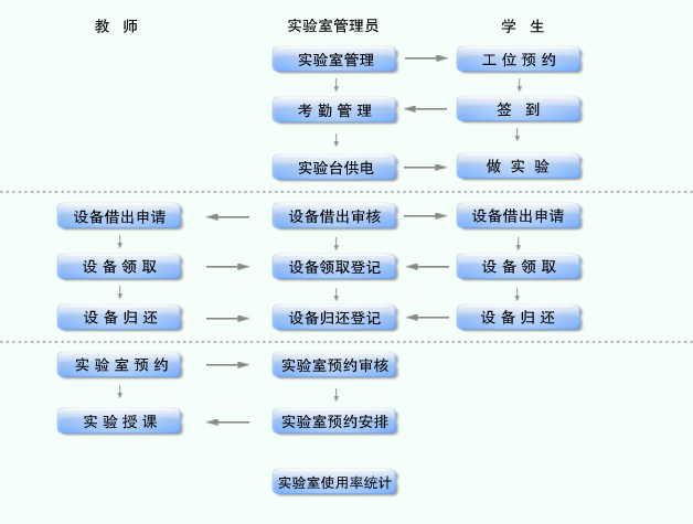 | 預約實驗室 | 通過系統(tǒng)預約申請整個實驗室開展相應的實驗教學。 |