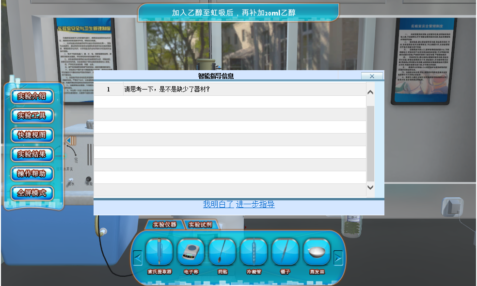 5、系統(tǒng)提供實(shí)驗(yàn)過程中的智能指導(dǎo)功能,該指導(dǎo)為啟發(fā)性指導(dǎo),通過一步步的提問式引導(dǎo),進(jìn)而啟發(fā)學(xué)生思考;