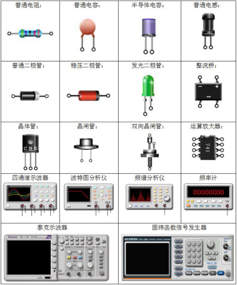 虛擬儀器:雙通道示波器、四通道示波器、八通道示波器、頻譜分析儀、頻率計(jì)、波特圖分析儀、電壓探針、差分電壓探針、直流電壓表、交流電壓表、直流電流表、交流電流表、勝利萬用表VC9802A、固緯信號(hào)發(fā)生器AFG-2005、泰克示波器TBS1102、電流探頭。