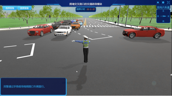道路交通指揮虛擬仿真實驗:實驗通過三維仿真技術(shù),再現(xiàn)了十字路口、交叉路口等不同道路場景,還原了不同道路情況下交通指揮前過程。包括交通警察手勢信號動作學習訓練、十字交叉路口指揮、路段指揮、交通事故現(xiàn)場指揮、警衛(wèi)狀態(tài)下的交通指揮、擁堵交叉路口的交通疏導、交通擁堵指揮綜合訓練、交通警衛(wèi)指揮綜合訓練八個模塊內(nèi)容。實驗過程中學習者自主判斷指揮需求,自主選擇正確合理的手勢信號,處置相關(guān)情況,保證指揮的場景中交通流行進。