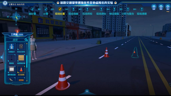 道路交通事故現(xiàn)場勘查實驗:本實驗通過三維仿真技術(shù)對道路交通事故案件現(xiàn)場進行再現(xiàn),還原案件發(fā)生與后期破案全過程。現(xiàn)場處理包括接處警、現(xiàn)場處置、現(xiàn)場調(diào)查、現(xiàn)場照相、現(xiàn)場測繪、物證提取、分析與復合、現(xiàn)場清理九個主要階段。后期破案流程包括:調(diào)取車行駛記錄,對比監(jiān)控確定行駛路線,分析研判,嫌疑人抓獲并審訊,現(xiàn)場指認等環(huán)節(jié)。