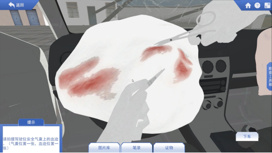 交通事故法醫(yī)學現(xiàn)場勘查實驗:實驗主要通過三維仿真技術(shù)對法醫(yī)進行交通事故現(xiàn)場勘察進行模擬,對案件發(fā)生過程、現(xiàn)場勘查內(nèi)容、交通傷的尸體檢驗、交通傷的損傷檢驗、酒精/毒品檢測、現(xiàn)場分析與重現(xiàn)進行模擬。包括調(diào)查取證、現(xiàn)場勘驗、車輛勘驗、生物檢材提取、法醫(yī)臨床學檢查等環(huán)節(jié),包括車輛監(jiān)控視頻照片、交通燈碎片照片、血跡、車輛撞擊情況照片等物證。