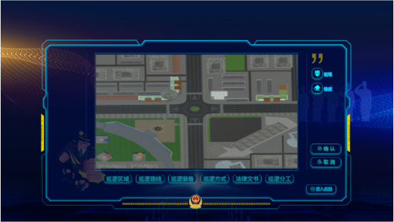 治安巡邏盤查虛擬仿真實驗:本實驗模擬治安巡邏過程,在虛擬社區(qū)中進行巡查,設置可疑情形,發(fā)現(xiàn)可疑情況開展當場盤問、檢查,并對相關人員、物品進行處置。學生可以根據(jù)指定或者自選任務,確定巡邏區(qū)域、巡邏路線、巡邏方式,佩帶巡邏裝備,攜帶法律文書,為治安巡邏實驗打下基礎。進入虛擬實驗,學生需要先學習中華人民共和國治安管理處罰法相關內(nèi)容,實驗提供20個不同的場景供學生進行選擇操作。