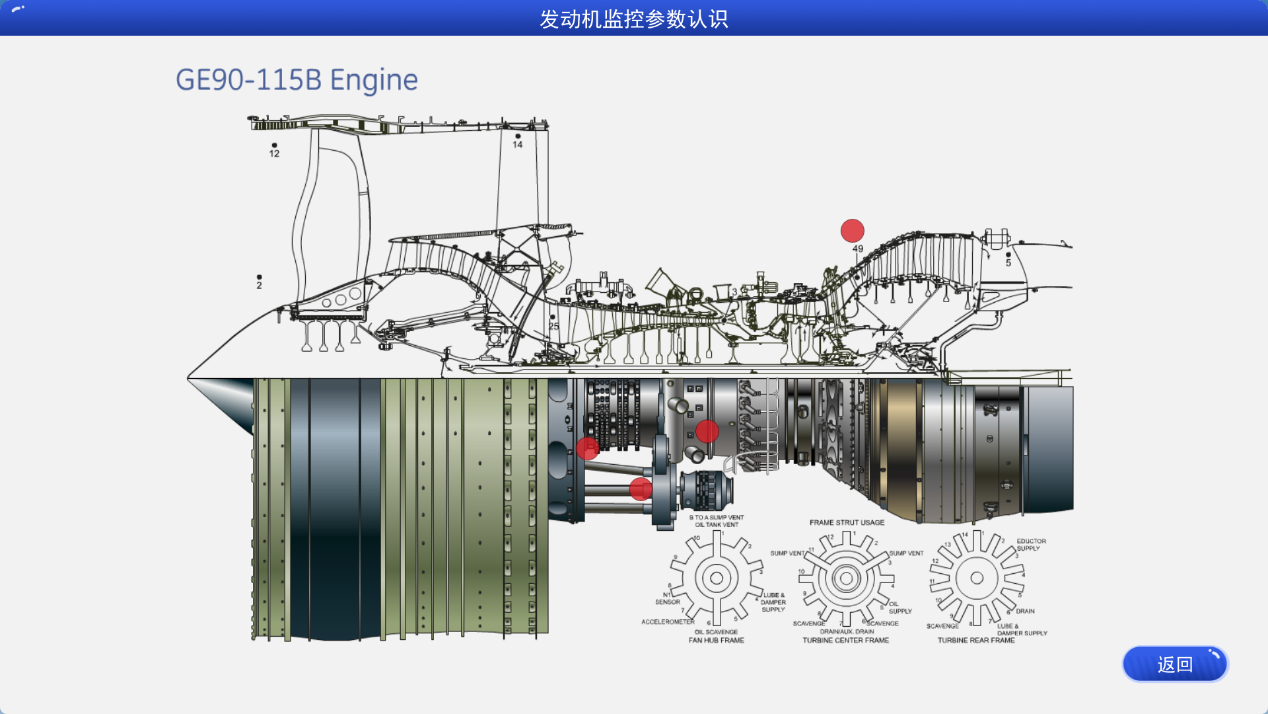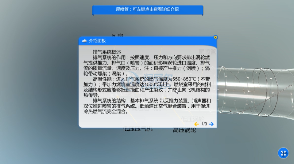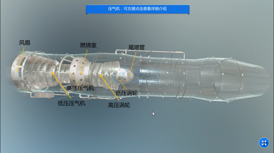通過本實驗學(xué)生可以了解航空發(fā)動機的構(gòu)成,點擊后可查看各部分構(gòu)件的詳細介紹。