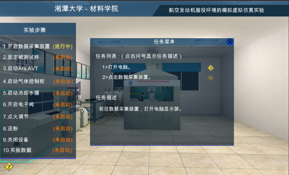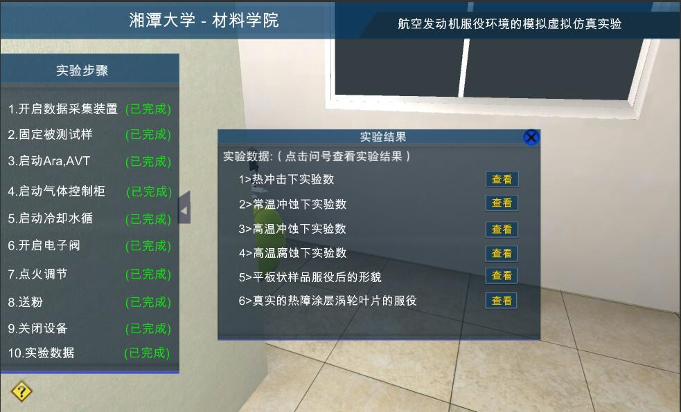 通過該虛擬仿真實驗,學(xué)生可以了解航空發(fā)動機、渦輪葉片、熱障涂層服役環(huán)境試驗?zāi)M裝置的各個功能;了解每個功能的實驗現(xiàn)象,熟悉熱障涂層服役環(huán)境試驗?zāi)M裝置操作方法,熟悉各種無損檢測裝置的使用方法。