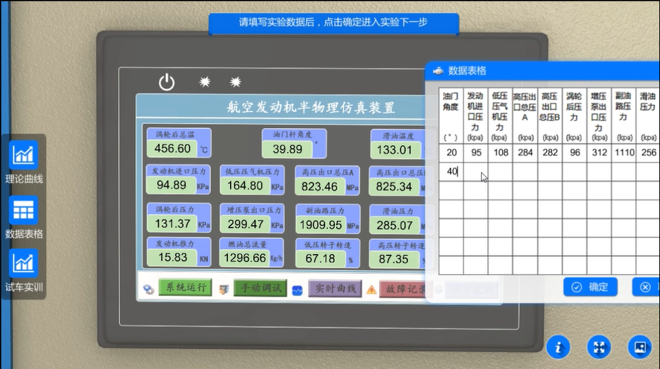 輸入試驗所需參數(shù)后啟動發(fā)動機,并將工況記錄在下面的表格中,點擊確定