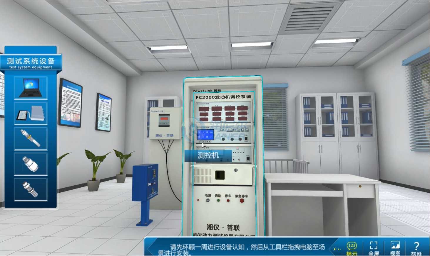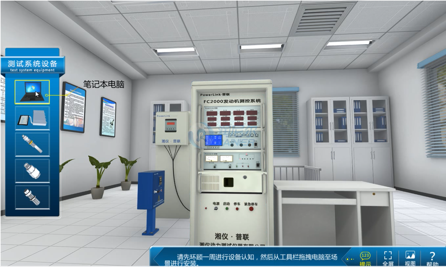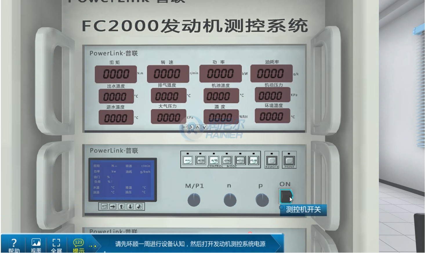 本實(shí)驗(yàn)可在虛擬三維實(shí)驗(yàn)室進(jìn)行漫游,進(jìn)行全方位的設(shè)備認(rèn)知。通過(guò)系統(tǒng)引導(dǎo)組裝測(cè)試設(shè)備,依次打開FC2000發(fā)動(dòng)機(jī)測(cè)控系統(tǒng)電源、打開電腦、啟動(dòng)測(cè)試軟件、設(shè)置采樣頻率、工控機(jī)電源、啟動(dòng)發(fā)動(dòng)機(jī)等到發(fā)動(dòng)機(jī)啟動(dòng)到額定轉(zhuǎn)速后,點(diǎn)擊軟件中的首通道選擇不同的通道查看對(duì)應(yīng)的實(shí)驗(yàn)曲線。
