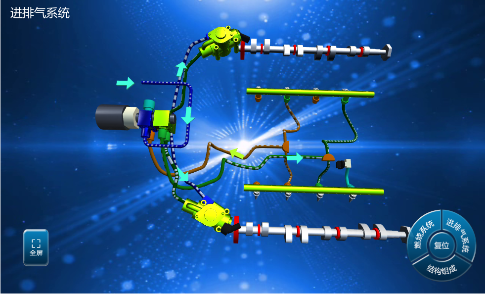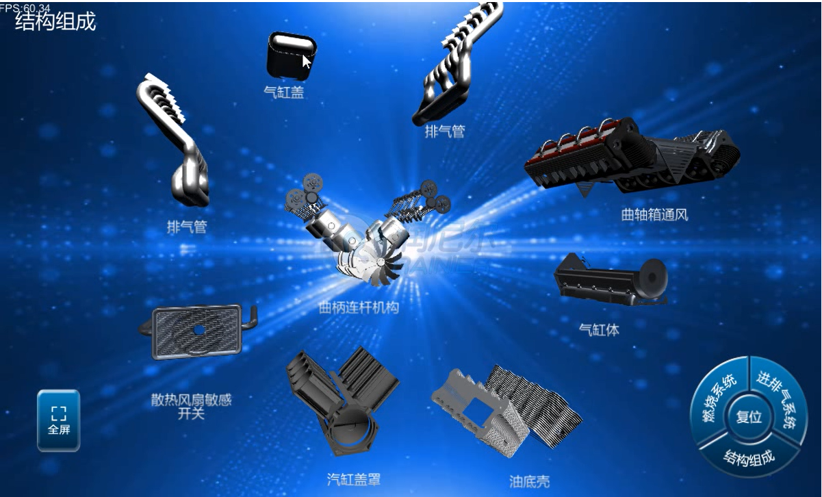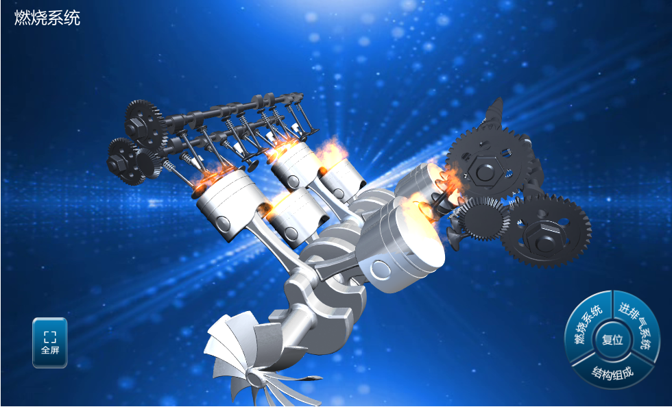 以三維互動(dòng)的形式,展現(xiàn)發(fā)動(dòng)機(jī)的結(jié)構(gòu)組成、燃燒系統(tǒng)、進(jìn)排氣系統(tǒng)。