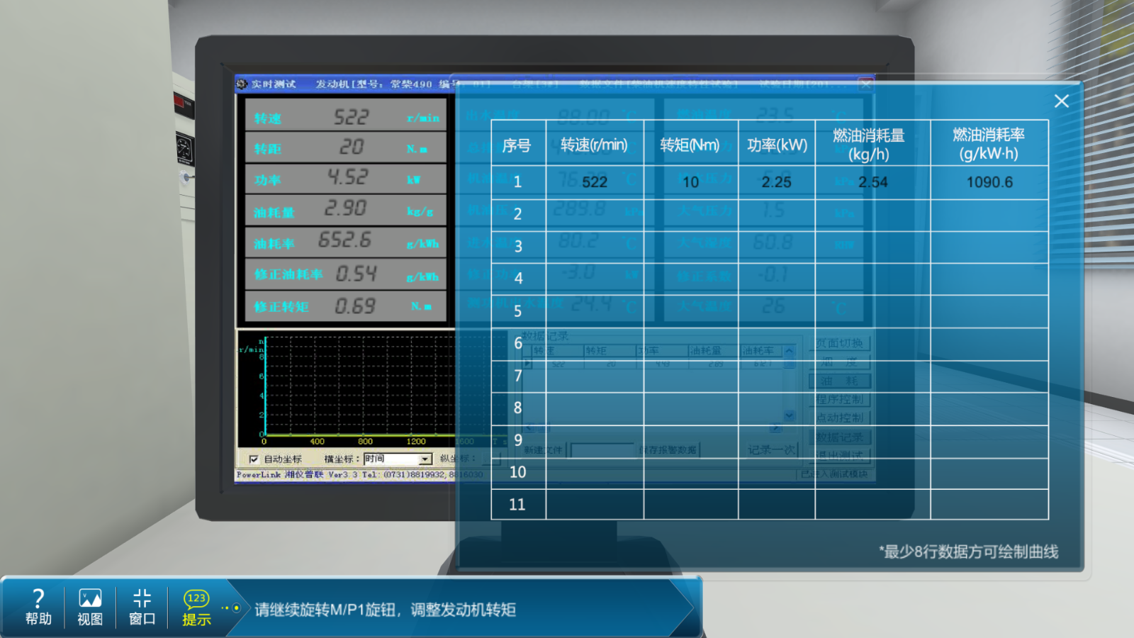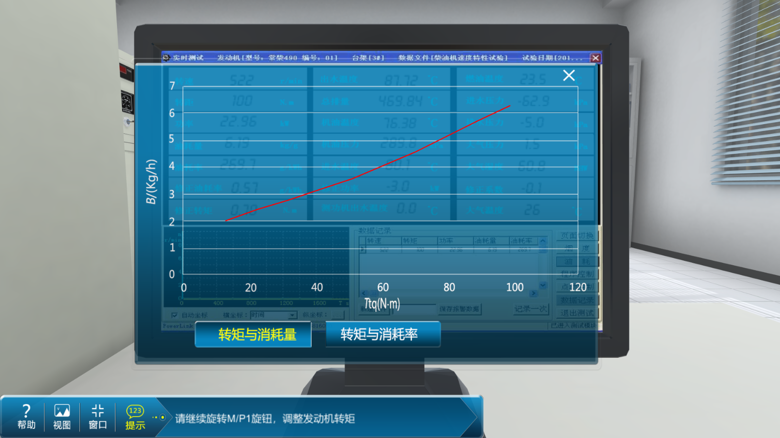 本實(shí)驗(yàn)可在虛擬三維實(shí)驗(yàn)室進(jìn)行漫游,進(jìn)行全方位的設(shè)備認(rèn)知。通過(guò)系統(tǒng)引導(dǎo)依次打開FC2000發(fā)動(dòng)機(jī)測(cè)控系統(tǒng)電源 、工控機(jī)電源、打開電腦、啟動(dòng)測(cè)試軟件、啟動(dòng)發(fā)動(dòng)機(jī)等到發(fā)動(dòng)機(jī)啟動(dòng)到額定轉(zhuǎn)速后,通過(guò)按發(fā)動(dòng)測(cè)控系統(tǒng)操作面板上的p1/p,m/n,旋轉(zhuǎn)p,M/P1按鈕來(lái)觀察并記錄不同扭矩下轉(zhuǎn)矩、功率、油耗量、油耗率、修正油耗率、修正轉(zhuǎn)矩等參數(shù)。至少記錄8組數(shù)據(jù)就可以繪制轉(zhuǎn)矩與消耗量,轉(zhuǎn)矩與消耗率關(guān)系曲線。