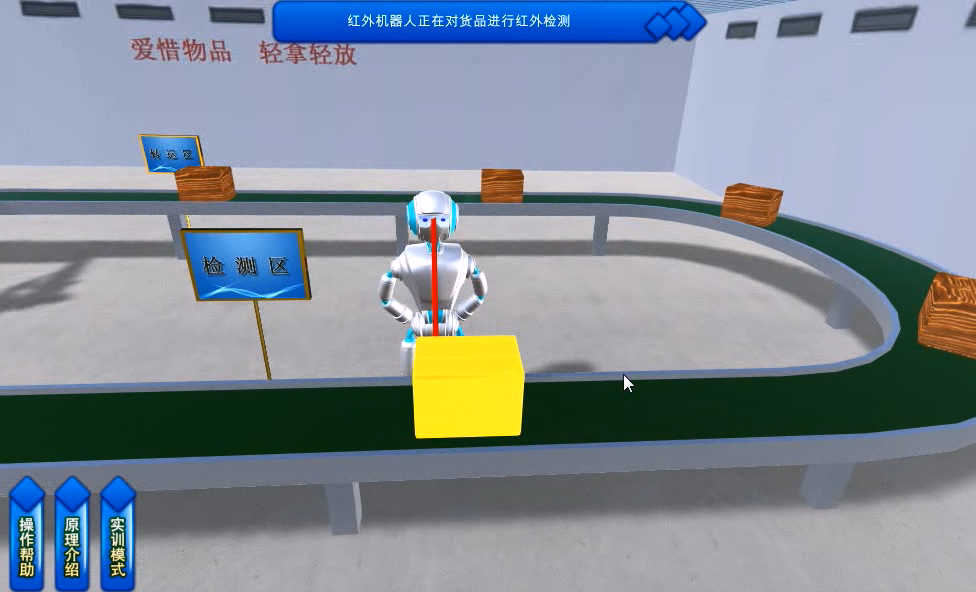 實(shí)驗(yàn)分為自動(dòng)和手動(dòng)兩種實(shí)驗(yàn)?zāi)J剑涸谑謩?dòng)模式下,點(diǎn)擊鼠標(biāo)揀選機(jī)器人,機(jī)器人通過紅外探測(cè)裝置對(duì)可掃描的區(qū)域內(nèi)貨物進(jìn)行掃描。