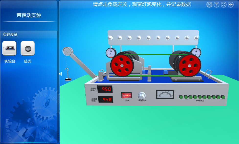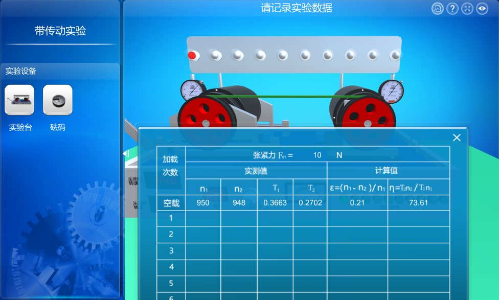 本虛擬仿真實驗提供仿真帶傳動實驗臺,實驗過程中模擬操作實驗設備,通過增減砝碼和調(diào)整負載開關,測得并記錄10組不同狀況下主動輪和從動輪的轉(zhuǎn)速、轉(zhuǎn)矩值,之后進行數(shù)據(jù)分析,用戶通過數(shù)據(jù)對比,了解帶傳動的工作特性。