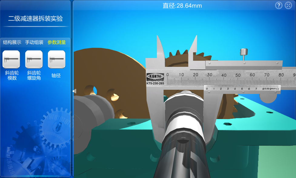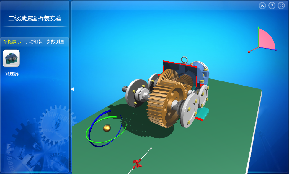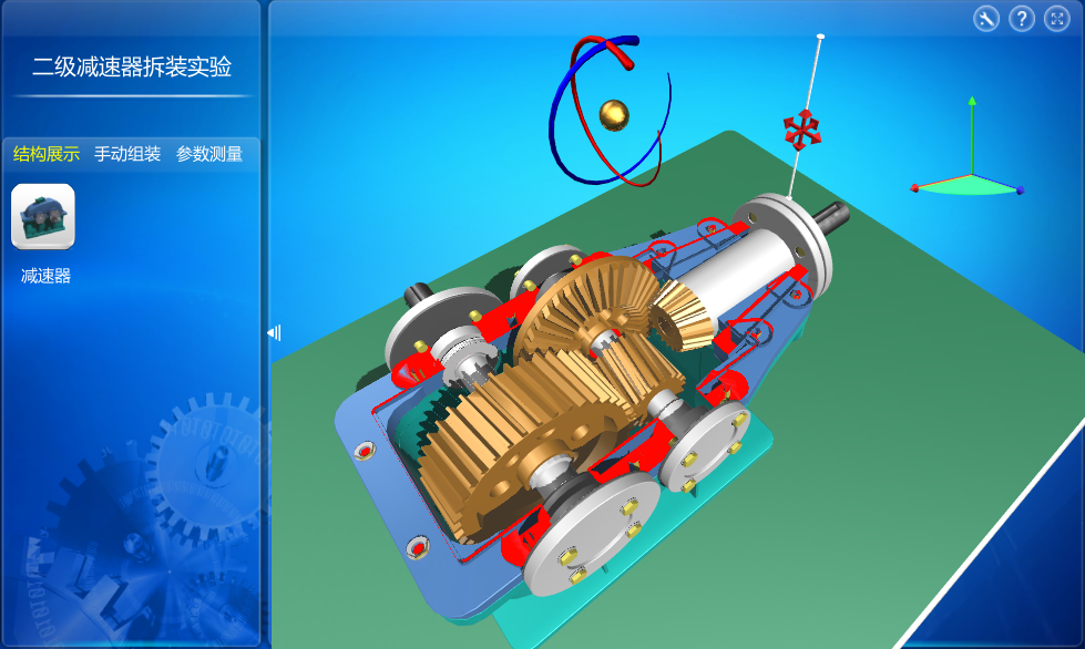 該實驗分為結(jié)構(gòu)展示、手動組裝、參數(shù)測量三個環(huán)節(jié),通過三個環(huán)節(jié)的操作,使用戶熟悉二級減速器的結(jié)構(gòu)組成和結(jié)構(gòu)特點,掌握減速器的工作原理。