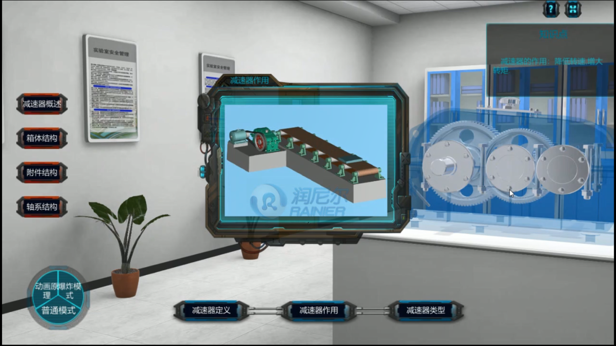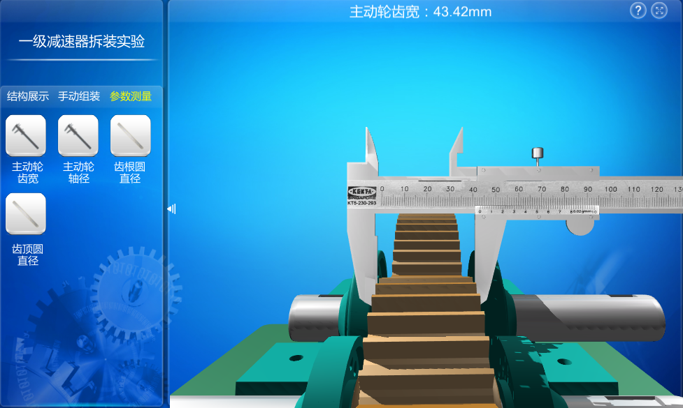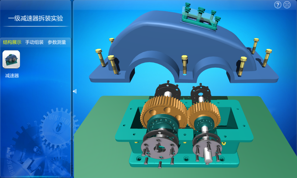 該實驗分為結(jié)構(gòu)展示、手動組裝、參數(shù)測量三個環(huán)節(jié),通過三個環(huán)節(jié)的操作,使用戶熟悉一級減速器的結(jié)構(gòu)組成和結(jié)構(gòu)特點,掌握減速器的工作原理。