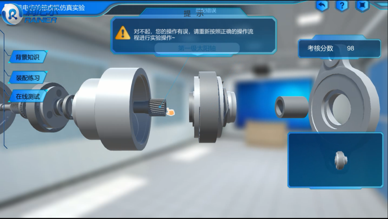 在線測試可以進行模擬裝配考核,并對錯誤的裝配方法進行提示,給予相應分數(shù)。