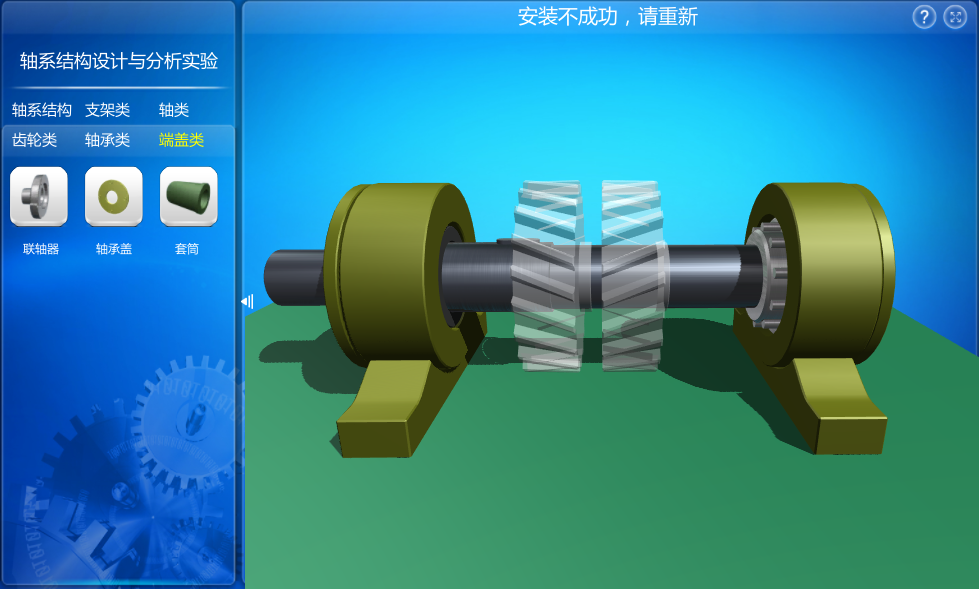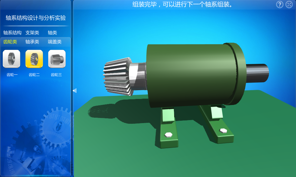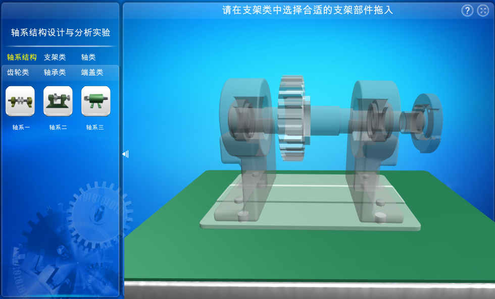 本虛擬仿真實驗軟件提供三種軸系結(jié)構(gòu)作為設計參考,用戶通過參考結(jié)構(gòu)進行分析并在零件庫中選擇正確的零部件進行組裝,最終組裝得到完整的軸系結(jié)構(gòu),熟悉并掌握軸系結(jié)構(gòu)的零件結(jié)構(gòu)設計、裝配關系等。