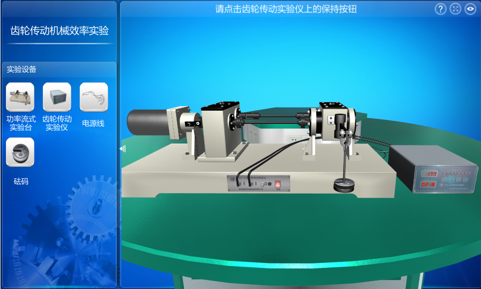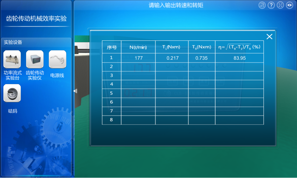本虛擬仿真實驗引導用戶進行實驗設備的搭建和連線,熟悉傳動設備的結(jié)構(gòu);然后根據(jù)操作提示引導用戶操作實驗設備,熟悉齒輪傳動效率的測試原理及方法;通過逐漸增加負荷并記錄齒輪傳動實驗儀上8組測得的相關參數(shù),以備后期處理使用。