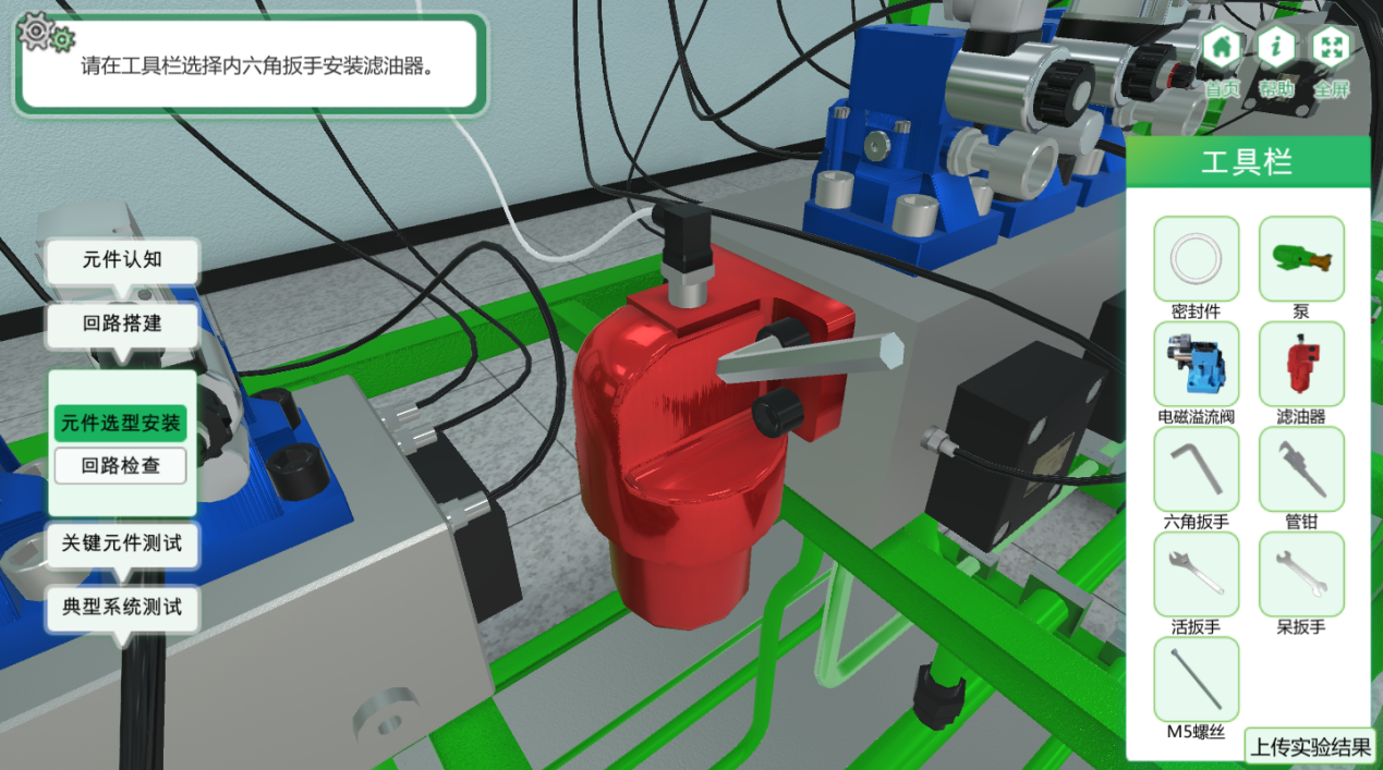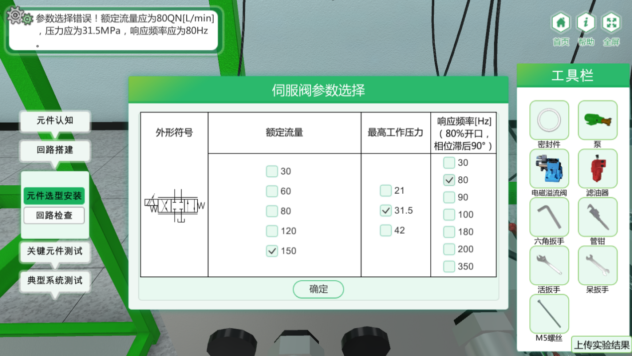 (1)元件選型安裝:在虛擬實(shí)驗(yàn)室界面出現(xiàn)“液壓原理圖”,對(duì)主泵、電磁溢流閥、濾油器、伺服閥進(jìn)行選型安裝。