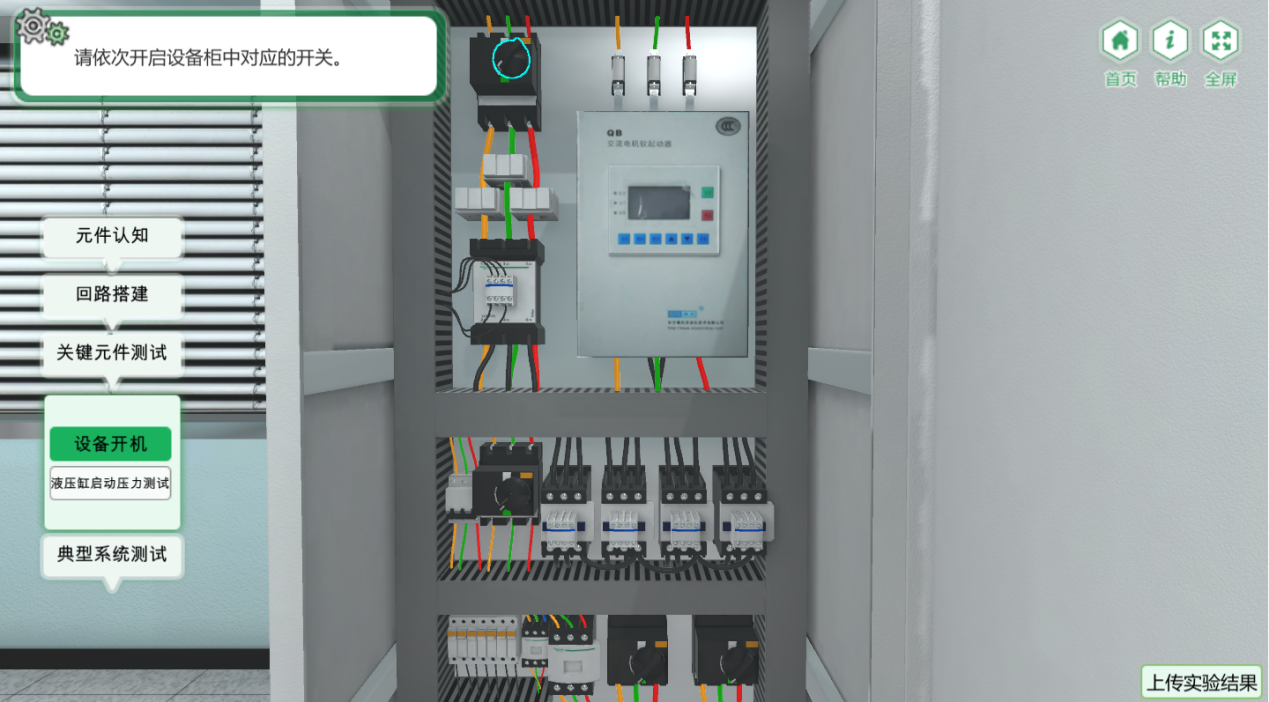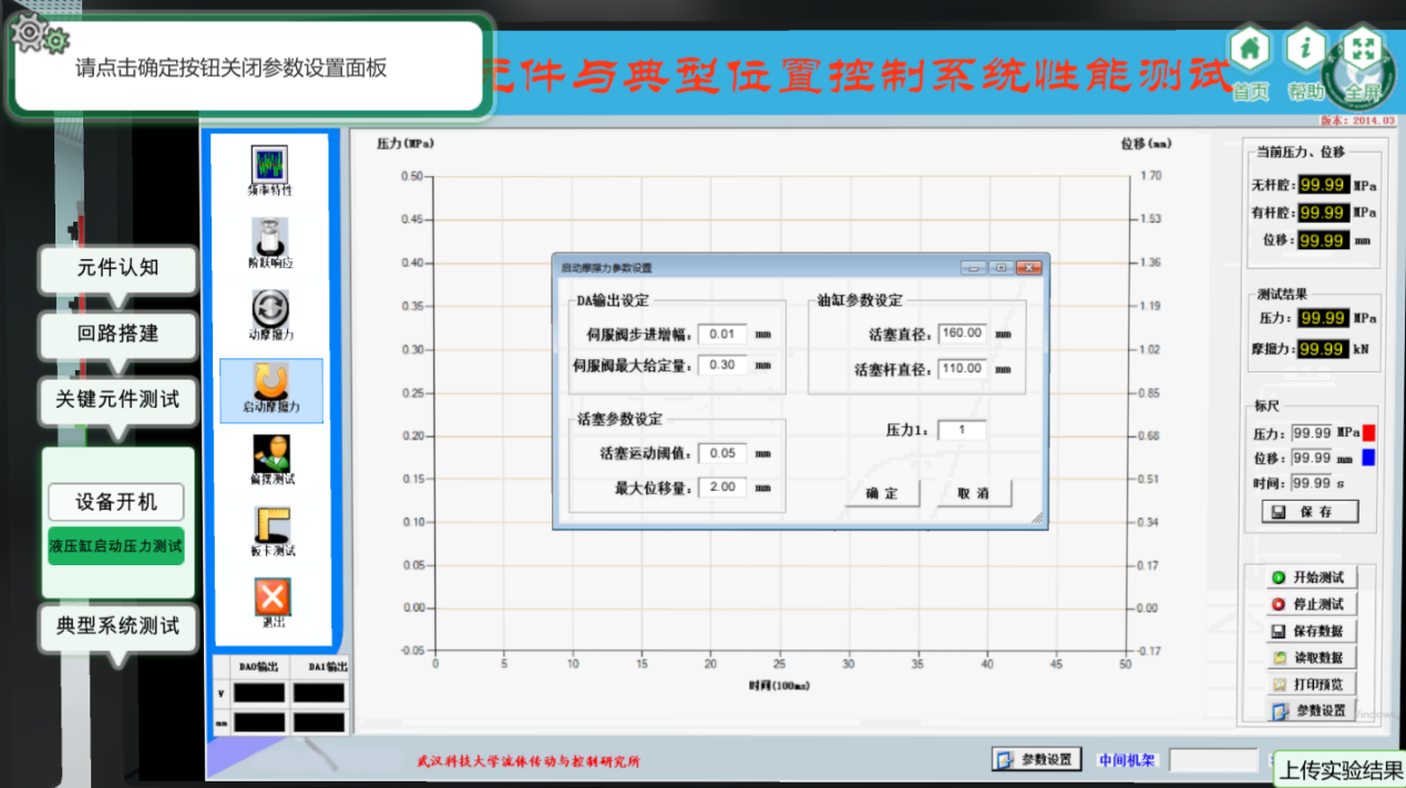 (3) 關(guān)鍵元件測(cè)試實(shí)驗(yàn)?zāi)K:包括設(shè)備開(kāi)機(jī)、液壓缸啟動(dòng)壓力測(cè)試