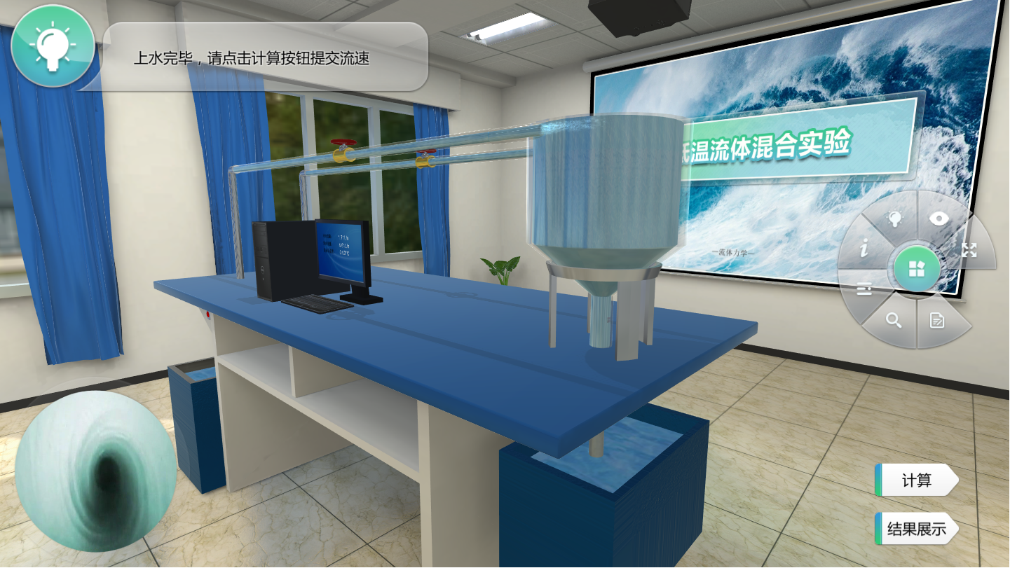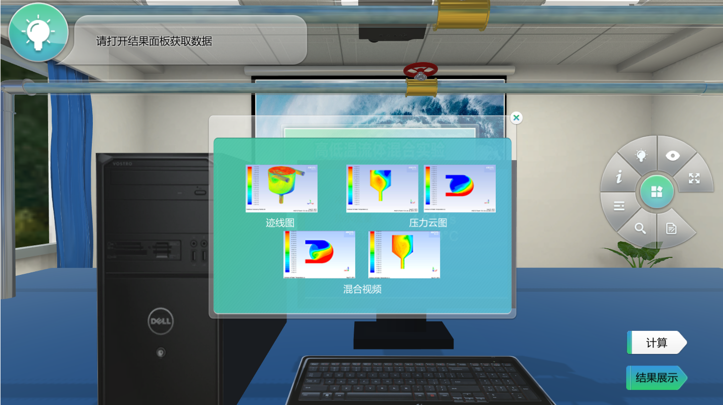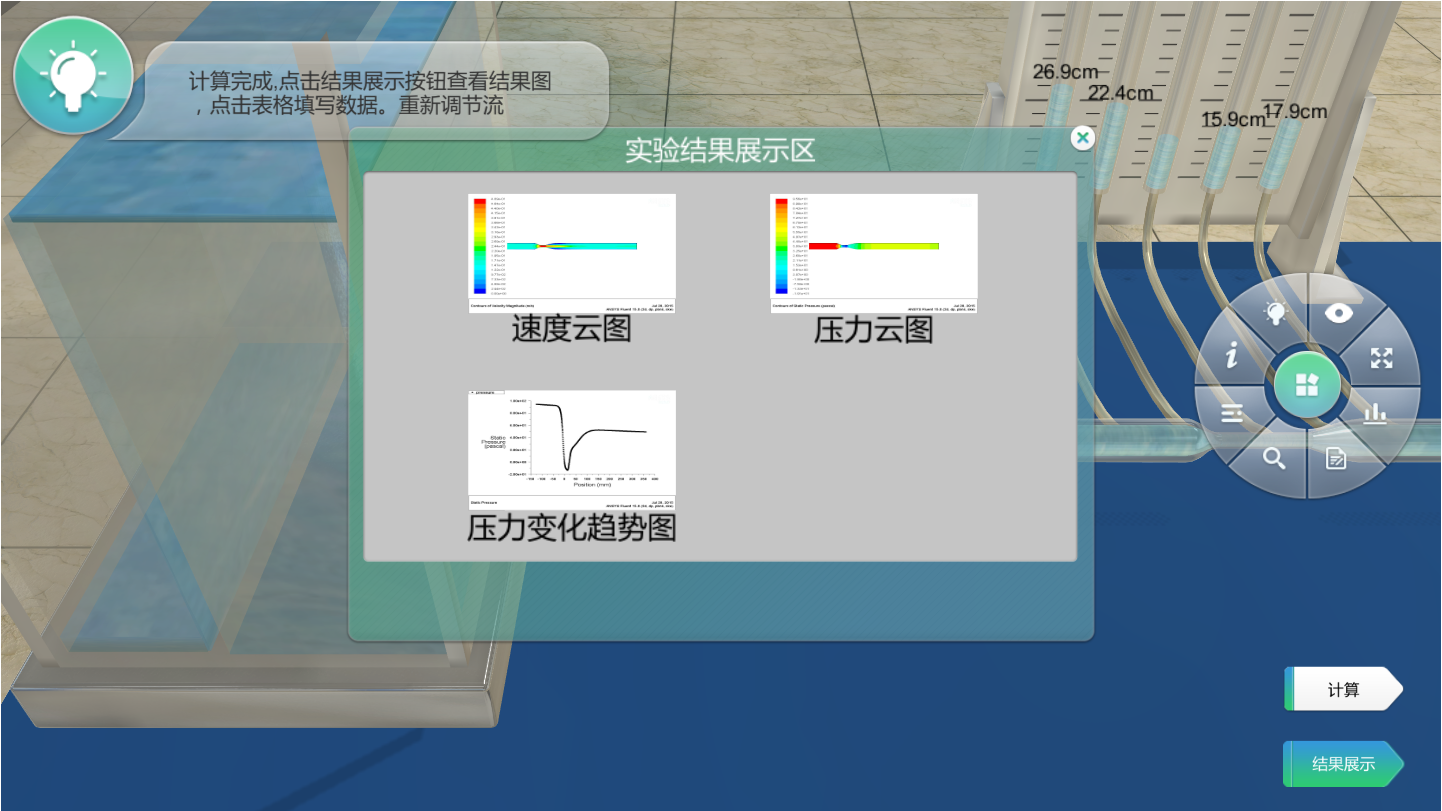 在三維實驗窗口中,用戶打開設(shè)備開關(guān)或擰動閥門,都會立即看到對應(yīng)實驗現(xiàn)象的發(fā)生,非常形象直觀。實驗過程中,用戶可從任意角度、任意距離查看實驗設(shè)備,互動操作簡單快捷。與此同時,用戶提交轉(zhuǎn)速、管徑比等實驗數(shù)據(jù)后,系統(tǒng)會自動調(diào)用Ansys仿真軟件,精確計算出水頭高度、云圖等實驗結(jié)果,并實時在實驗窗口中予以顯示。由于該系統(tǒng)借助專業(yè)軟件Ansys進(jìn)行仿真計算,具有實驗結(jié)果準(zhǔn)確的特點(diǎn),對實際實驗亦具有極強(qiáng)的指導(dǎo)作用。