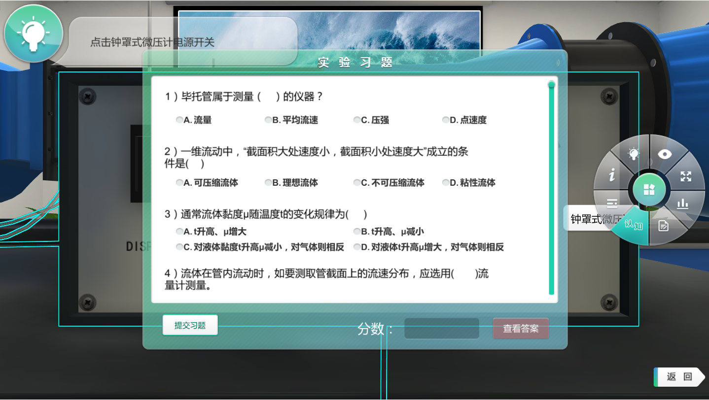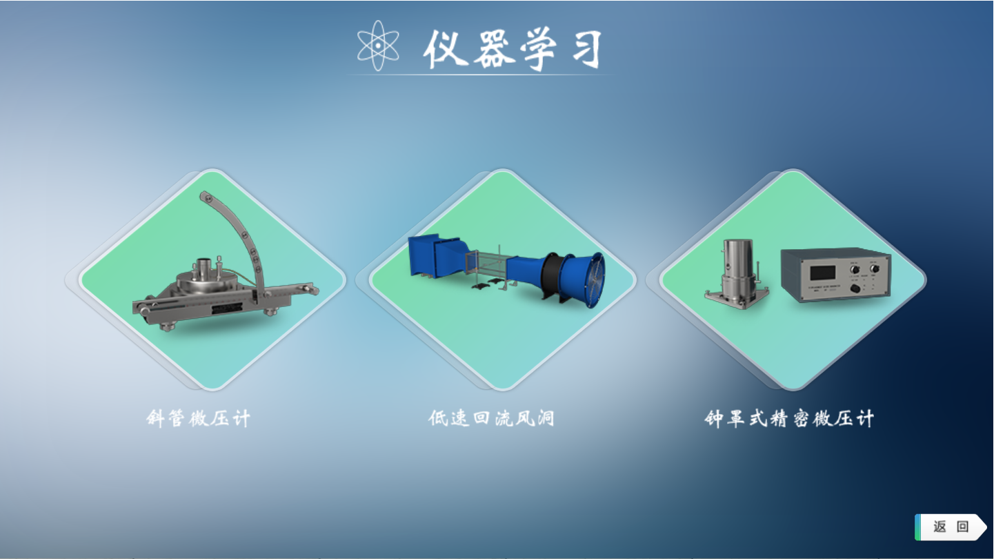 ① 首界面進(jìn)行斜管微壓計、低速回流風(fēng)洞和鐘罩式精密微壓計儀器學(xué)習(xí)