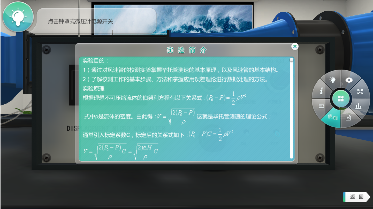 本虛擬實驗提供斜管微壓計、低速回流風(fēng)洞和鐘罩式精密微壓計的儀器學(xué)習(xí),模擬了畢托管標(biāo)定實驗的完整實驗流程,軟件提供實驗相關(guān)介紹、實驗習(xí)題訓(xùn)練、設(shè)備認(rèn)知、數(shù)據(jù)表格自動填寫等功能,幫助學(xué)生預(yù)習(xí)和復(fù)習(xí)鞏固畢托管標(biāo)定實驗的相關(guān)知識,加深實驗理解。