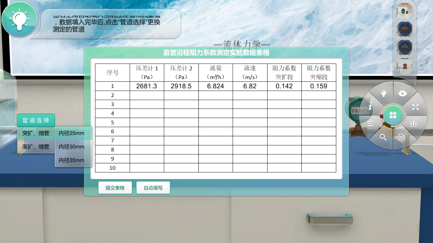 本虛擬實驗?zāi)M了直管局部阻力系數(shù)測定實驗的完整實驗流程,提功了包括突擴(kuò)、縮管內(nèi)徑25mm、30mm、35mm和漸擴(kuò)、縮管25mm、30mm、35mm的管道選擇,同時軟件提供直管局部損失阻力系數(shù)測定實驗相關(guān)介紹、實驗習(xí)題訓(xùn)練、設(shè)備認(rèn)知、數(shù)據(jù)表格自動填寫等功能,幫助學(xué)生預(yù)習(xí)和復(fù)習(xí)鞏固實驗的相關(guān)知識,加深實驗理解。