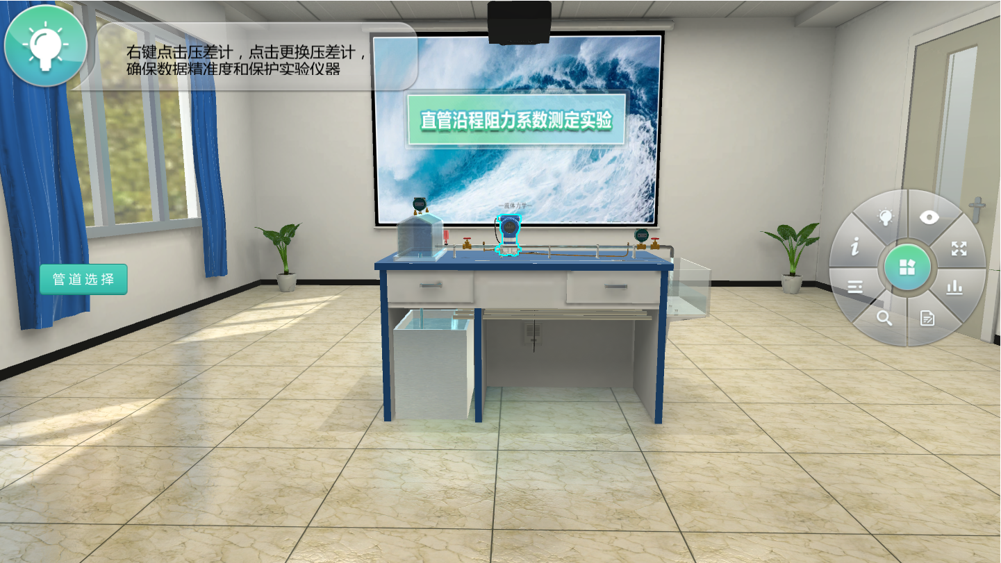 本虛擬實驗?zāi)M了直管沿程阻力系數(shù)測定實驗的完整實驗流程,提功了包括有機(jī)玻璃管內(nèi)徑8mm、15mm和鑄鐵管內(nèi)徑15mm的管道選擇,同時軟件提供直管沿程阻力系數(shù)測定實驗相關(guān)介紹、實驗習(xí)題訓(xùn)練、設(shè)備認(rèn)知、數(shù)據(jù)表格自動填寫等功能,幫助學(xué)生預(yù)習(xí)和復(fù)習(xí)鞏固實驗的相關(guān)知識,加深實驗理解。