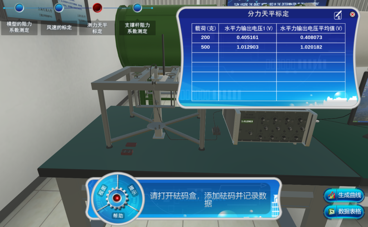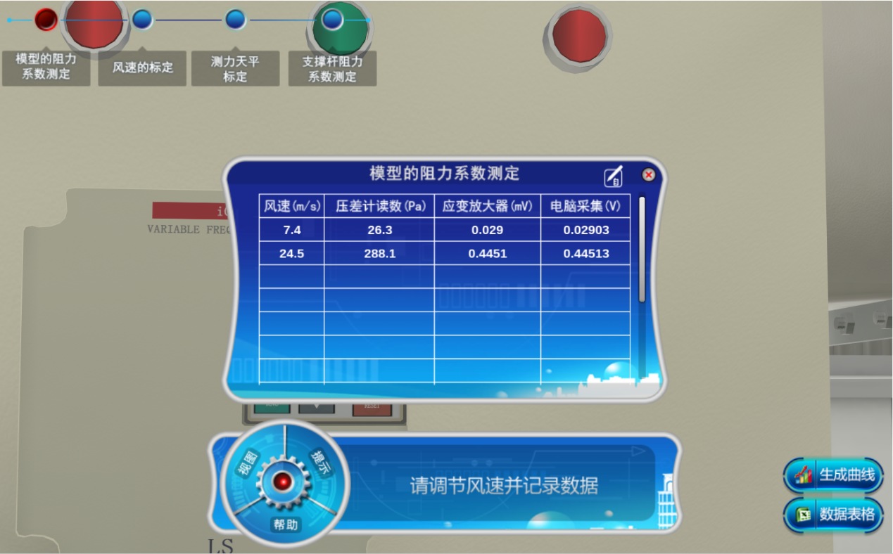 本虛擬實驗?zāi)M了繞流物理模型阻力系數(shù)測定虛擬實驗,提供模型的阻力系數(shù)測定、風(fēng)速的標(biāo)定、測力天平的標(biāo)定和支撐桿阻力系數(shù)測定四種參數(shù)選擇,通過調(diào)節(jié)風(fēng)速得到不同模型阻力系數(shù)曲線,通過天平標(biāo)定,利用標(biāo)準(zhǔn)砝碼和標(biāo)定支架率定三分力天平三方向的電壓輸出值和力、力矩的關(guān)系曲線;在實驗過程中提供多角度觀測方式、操作幫助,加深對實驗理解。