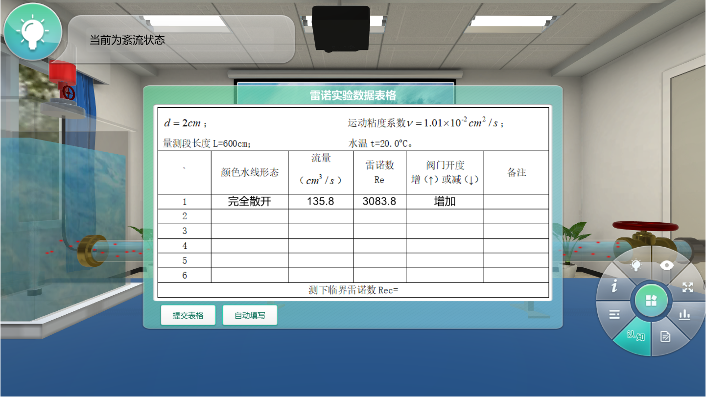 本虛擬實驗?zāi)M了雷諾實驗的完整實驗流程,軟件提供實驗相關(guān)介紹、實驗習(xí)題訓(xùn)練、設(shè)備認(rèn)知、數(shù)據(jù)表格自動填寫等功能,幫助學(xué)生預(yù)習(xí)和復(fù)習(xí)鞏固雷諾實驗的相關(guān)知識,加深實驗理解。