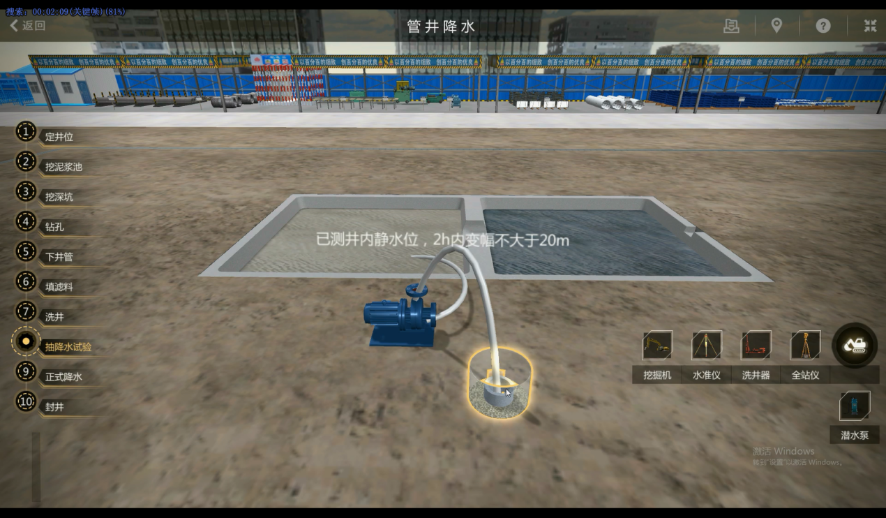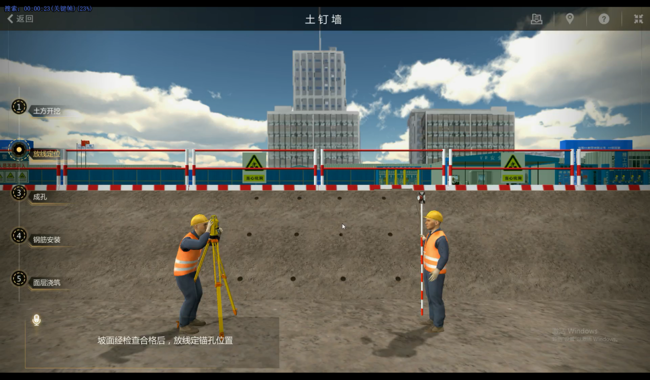 本系統(tǒng)包含管井降水、土方工程、旋挖鉆機(jī)成孔、長螺旋成孔、土釘墻、螺桿鉆機(jī)干作業(yè)、套桿鉆機(jī)水作業(yè)、基坑監(jiān)測等八個(gè)模塊,涵蓋了土方施工(深基坑)的各個(gè)關(guān)鍵環(huán)節(jié)。每個(gè)模塊支持單獨(dú)進(jìn)行實(shí)訓(xùn),每個(gè)模塊支持單獨(dú)進(jìn)行實(shí)訓(xùn)練習(xí),系統(tǒng)提供教學(xué)模式、操作模式和考核模式,以適配不同的教學(xué)需求;此外,系統(tǒng)開發(fā)PC版本和3D大屏版本,可廣泛在虛擬仿真實(shí)訓(xùn)基地進(jìn)行展示和教學(xué)使用。