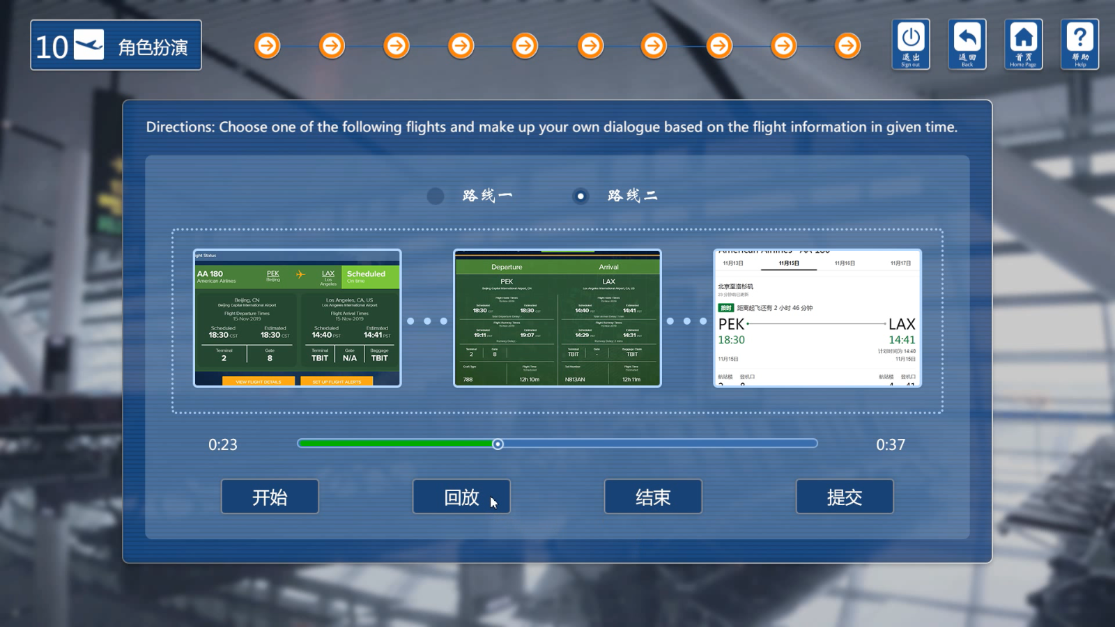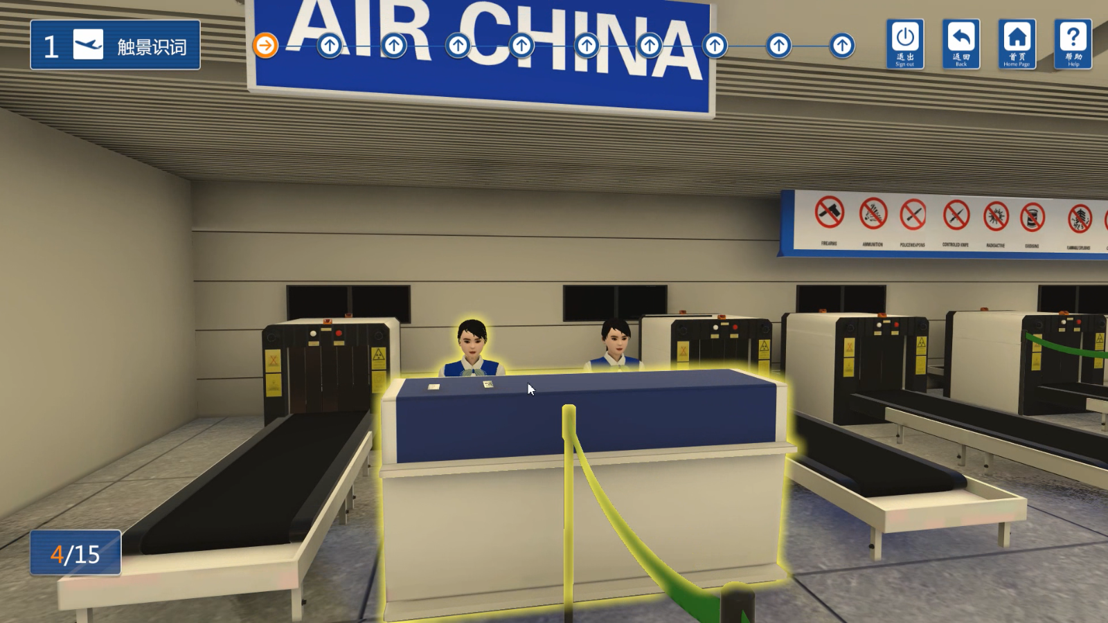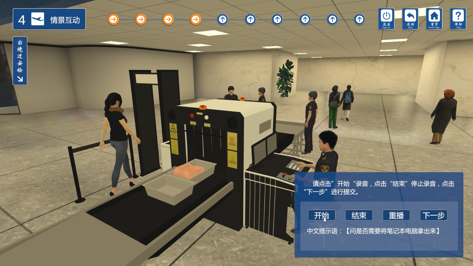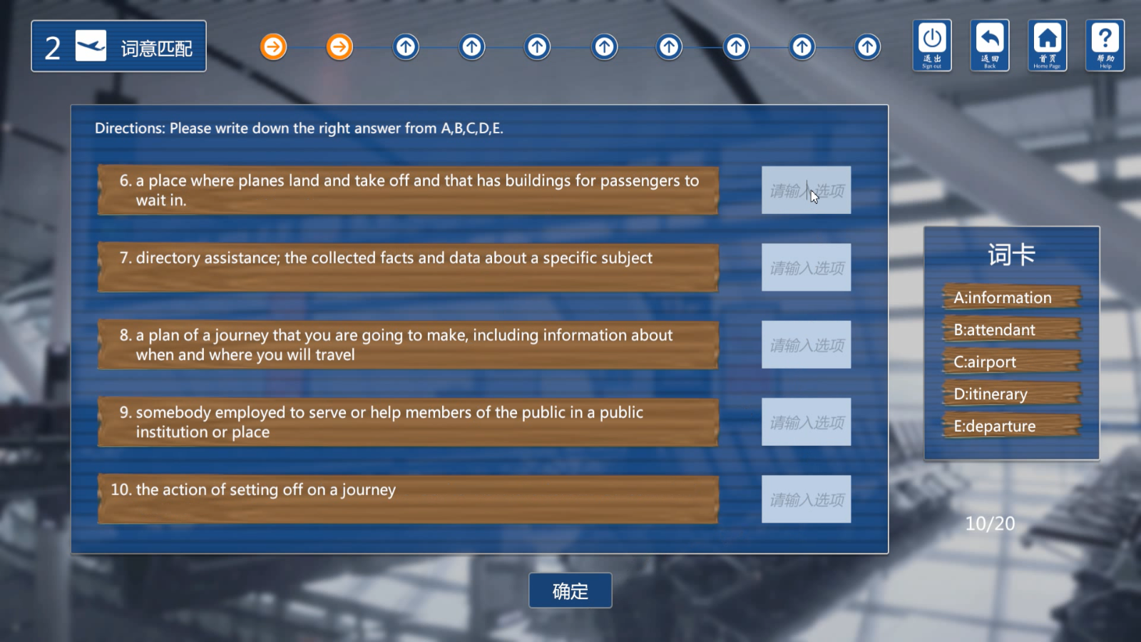 本課程共10個模塊,分別為:觸景識詞、詞意匹配、聽寫/填詞、情景互動、詞語排序、回答問題、復(fù)合聽寫、書寫概要、情景描述、角色扮演。以上模塊根據(jù)學(xué)生的具體學(xué)習(xí)情況可組合為四種模式:操練模式、體驗?zāi)J?、考核模式、定制模式。學(xué)生以旅客身份進行角色扮演,練習(xí)在機場問詢、辦理值機、出入境、過安檢等情況的語言交流,并進行機場相關(guān)單詞的考核學(xué)習(xí)。系統(tǒng)支持按模塊保存和學(xué)生成績互評功能,可從聽說讀寫等不同方面訓(xùn)練學(xué)生英語語言輸出能力。