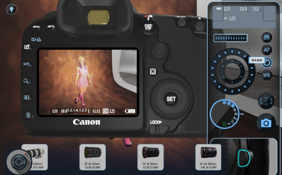 人像攝影:系統(tǒng)提供功能完備的虛擬單反相機(jī),學(xué)生在攝影棚(含1個背景幕布)虛擬場景中拍攝人物照片。了解、練習(xí)單反相機(jī)的操作和使用,提升人物攝影能力。無固定步驟,學(xué)生可自由、反復(fù)操作??梢哉{(diào)節(jié)佳能EOS 5D3虛擬相機(jī)的焦距、對焦、光圈、快門、ISO、白平衡等參數(shù),如同真實(shí)相機(jī)那樣調(diào)節(jié)構(gòu)圖、曝光、景深。相機(jī)可橫持、豎持、旋轉(zhuǎn)。含自動對焦功能。相機(jī)提供可換鏡頭功能并提供多個鏡頭可換,包含廣角鏡頭、標(biāo)準(zhǔn)鏡頭、長焦鏡頭。提供多種人物模特,可以放置模特,編輯模特(移動、旋轉(zhuǎn)、改變姿勢),嘗試多種人物組合。提供虛擬測光表,可跟根據(jù)場景亮度、光圈、ISO得出標(biāo)準(zhǔn)曝光下的快門時間??砷_關(guān)室內(nèi)大燈??煞胖萌峁庀?,調(diào)節(jié)柔光箱的位置、角度和亮度,精確布光。可保存和瀏覽拍攝的照片,查看拍攝參數(shù)??蓪⒄掌瑢?dǎo)出jpg文件。提供器材和攝影技巧的圖文知識介紹。