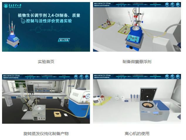 植物生長調(diào)節(jié)劑2,4-DI制備、質(zhì)量控制與活性評價貫通實驗共分為3個模塊:植物生長調(diào)節(jié)劑2,4-DI異辛酯的合成及鑒定、2,4-滴異辛酯微囊懸浮劑的制備及性能測定、活性測定。學(xué)生在實驗操作的過程中,能夠熟悉整個實驗完整的流程,掌握實驗設(shè)備的組裝、調(diào)節(jié)、應(yīng)用,實驗試劑的量取、添加等操作,將傳統(tǒng)的實驗以三維仿真的形式體現(xiàn),使學(xué)生更好地掌握實驗內(nèi)容。實驗還包含考核模式,完成考核模式后,系統(tǒng)會根據(jù)學(xué)生的操作準確程度給出評定分數(shù),從而考察學(xué)生對知識點的掌握程度。
