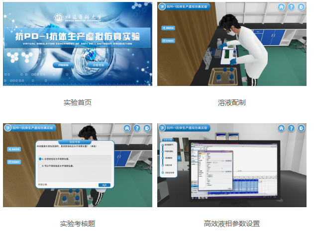抗PD-1抗體生產(chǎn)過程中高效液相分析抗體含量的操作技能對藥學(xué)專業(yè)學(xué)生的儀器分析能力培養(yǎng)非常重要,但由于其操作復(fù)雜、實驗要求高和條件限制,在實體實驗中難以完成。學(xué)生通過在三維場景中實現(xiàn)從流動相脫氣、儀器預(yù)熱、參數(shù)設(shè)置、高效液相使用、分析方法設(shè)置、數(shù)據(jù)整理等方面的演練操作,熟悉高效液相分析的操作過程,根據(jù)實驗操作提示和物體高亮提示,使用各種工具進行實驗操作,最后完成整體的實驗流程;關(guān)鍵計分點在無操作提示條件下進行實驗操作,系統(tǒng)可自動判斷操作是否正確,實驗操作結(jié)束后,針對操作過程設(shè)置考核點可彈出最終操作得分。