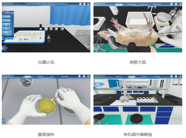 該實驗可以作為實物動物實驗的補充和替代,在虛擬實驗環(huán)境中,用戶可以根據(jù)系統(tǒng)文字圖片提示,控制鼠標鍵盤進行交互,多視角觀看動物實驗操作、選擇注射器、手術(shù)刀、藥劑、鑷子等實驗儀器或工具進行操作,掌握相關(guān)知識點。用戶能通過完成該虛擬實驗,達到認知實驗總體流程,掌握病毒感染動物的過程及檢測指標;中毒模型的建立及解救;容積測量儀的使用等操作方法,掌握實驗相關(guān)理論知識。
