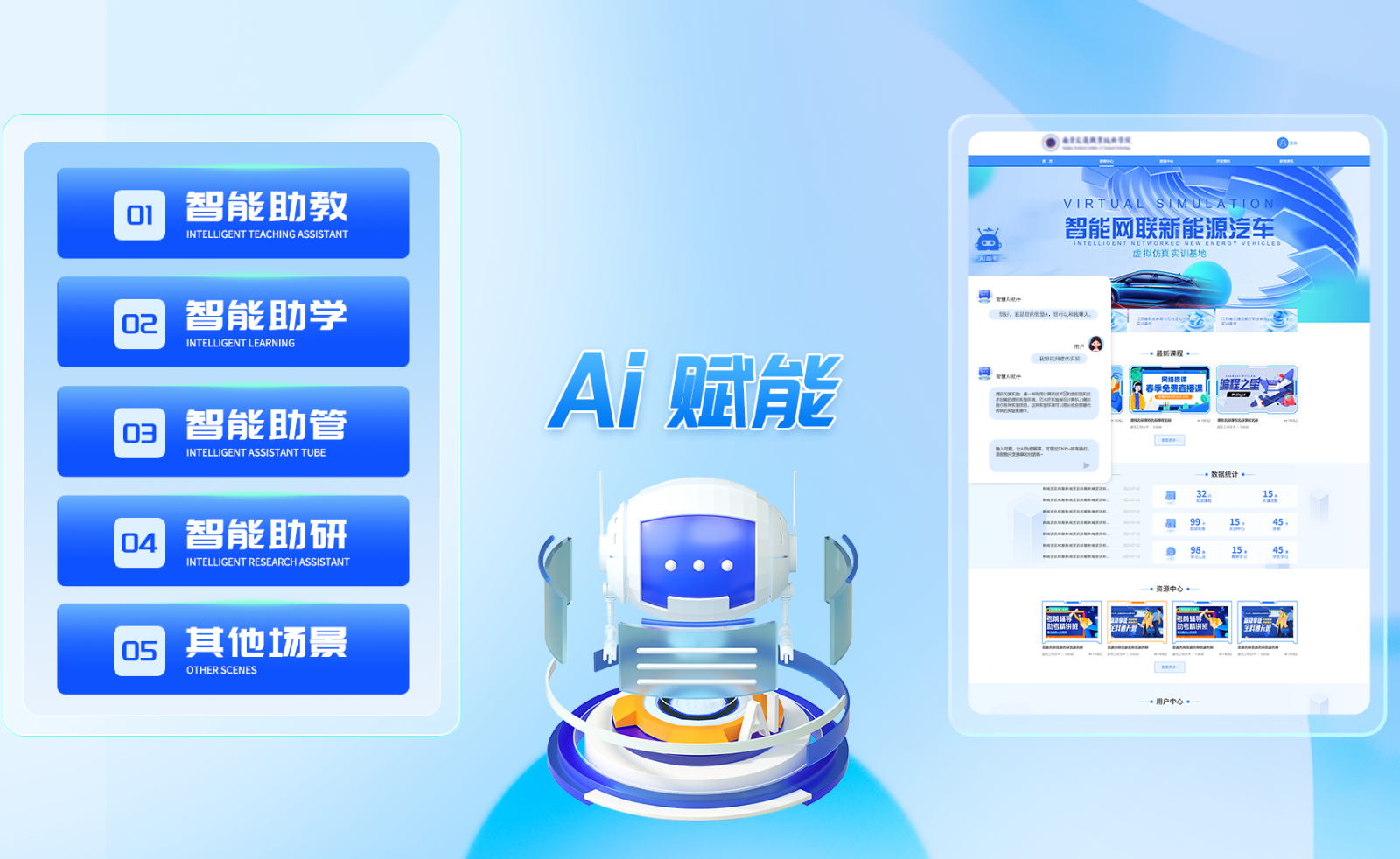 可基于學?,F有建設內容,包括但不限于各專業(yè)學科虛擬仿真實驗、五大金課、虛擬仿真實驗教學中心、虛擬仿真實驗室、智慧實驗室、管理平臺等,通過人工智能技術進一步賦能,構建更加智能化、網絡化、個性化、終身化的教育體系。