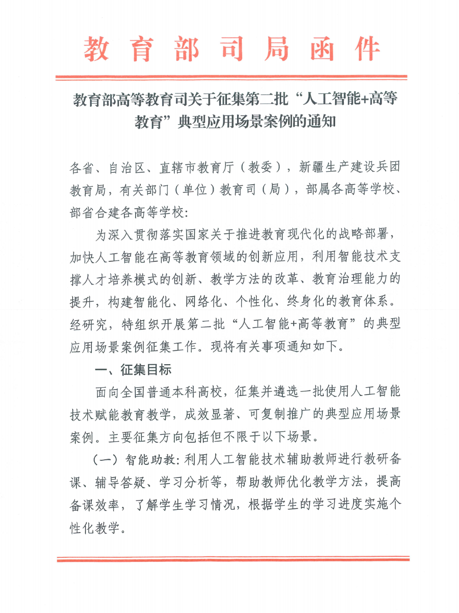 近期,教育部面向全國本科高校啟動了第二批“人工智能+高等教育”典型應用場景案例的征集工作,旨在遴選出一批使用人工智能技術賦能教育教學的典型案例,鼓勵高校積極探索人工智能在教育教學、管理、科研等方面的創(chuàng)新應用。